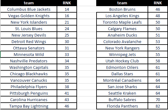 Here is the breakdown by team, starting with the Atlantic Division, with 4NFO standing for 4 Nations Face-Off.
