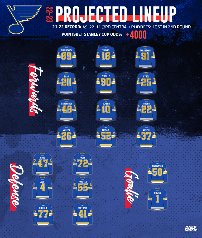 The team saw breakout seasons from a handful of young players, as Robert Thomas, Jordan Kyrou and Pavel Buchnevich all cracked the 70-point plateau for the first time in their respective careers. Veteran winger Vladimir Tarasenko also returned to star form after having his previous two seasons had been derailed due to injury, as he scored a career-high 82 points.