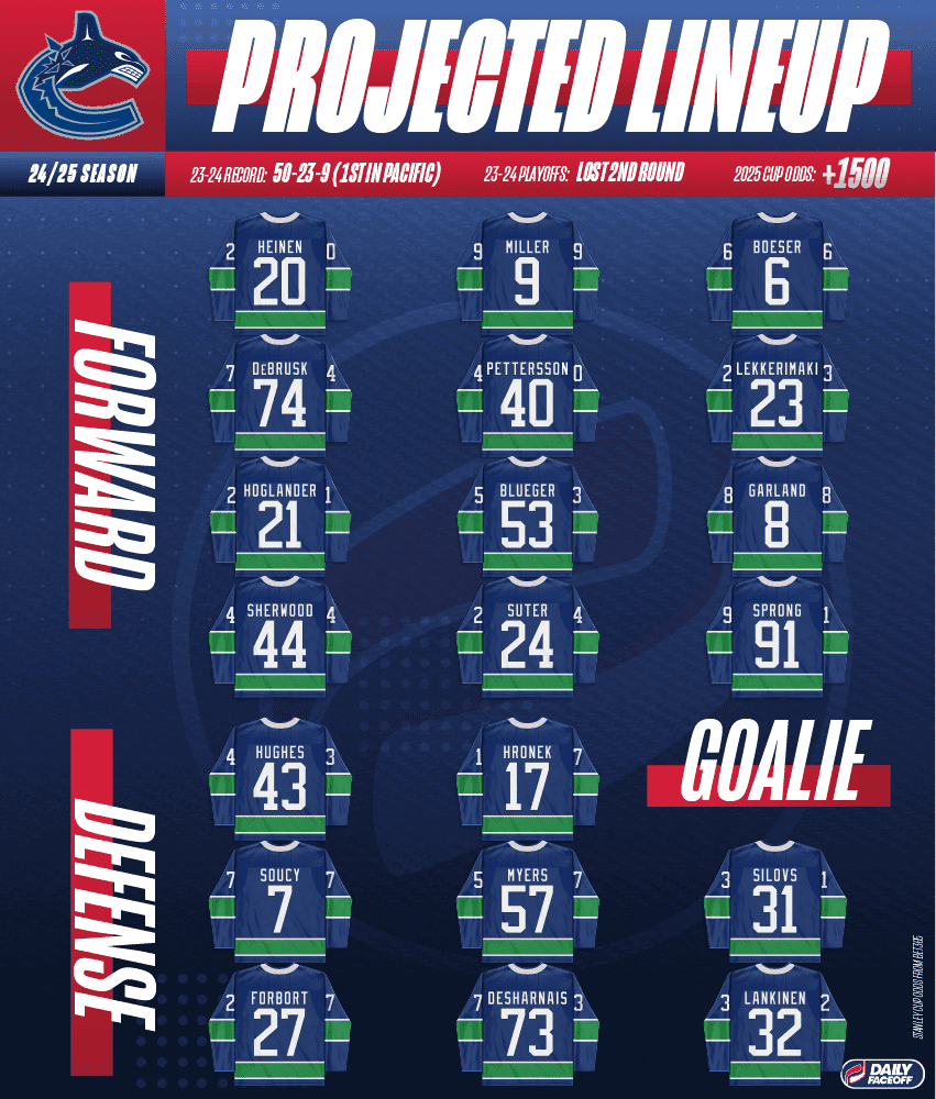 For all the oomph Sherwood, Danton Heinen (17 G), and Daniel Sprong (43P in 76 GP) will add to the Canucks’ depth at even strength, Tocchet still needs more from his team on the man advantage. Vancouver finished 12th in that department despite a top unit that combined Petterson, Miller, Boeser, and Hughes (17G, 92P).