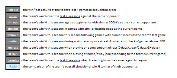 The database stores win percentages for teams when playing under the following situational circumstances:
