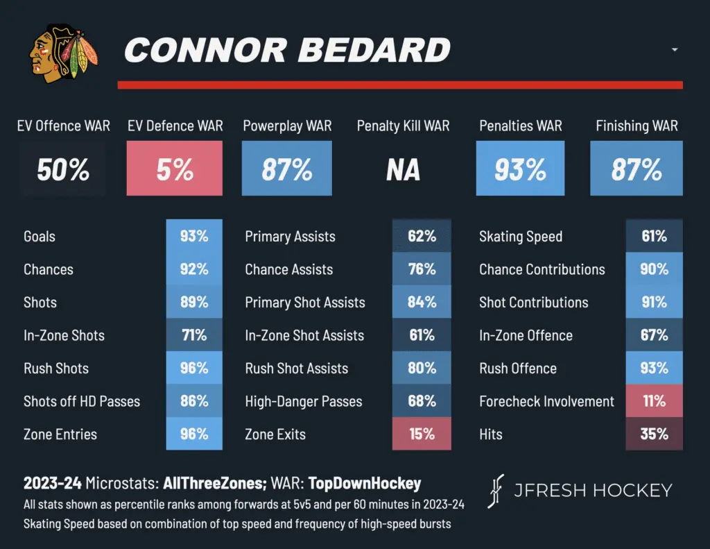 Should anyone be concerned about his defense? No, not really. His lackluster defensive impact is not strictly from playing on a lottery team, though. Teammate Jason Dickinson and fellow building block Alex Vlasic provide premium defensive value. While coach Luke Richardson has been pleased with gradual gains in Bedard’s defensive habits, the data shows he’s played the one-way game you might expect from a teenage phenom.