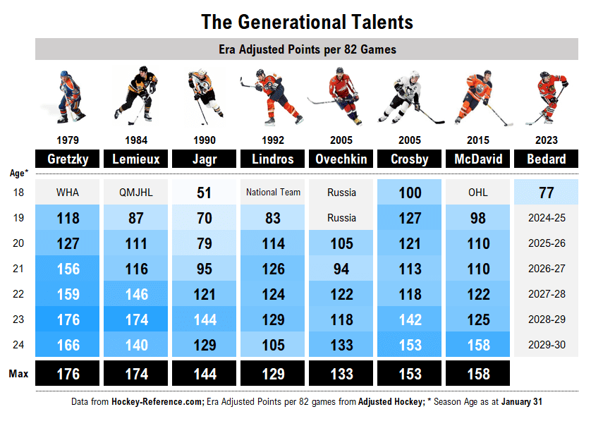 For Lemieux, his ascension was slightly slower by his lofty standards, hurt by a lack of quality teammates in his early days in Pittsburgh. Jagr, only arriving in North America at 18, marinated a little slower than the others. Crosby and McDavid offer modern templates – hugely hyped, modestly-sized centers and products of Canada’s junior hockey system. Both were era-adjusted 100-point scorers as teens and era-adjusted 140-point scorers by their mid-20s.