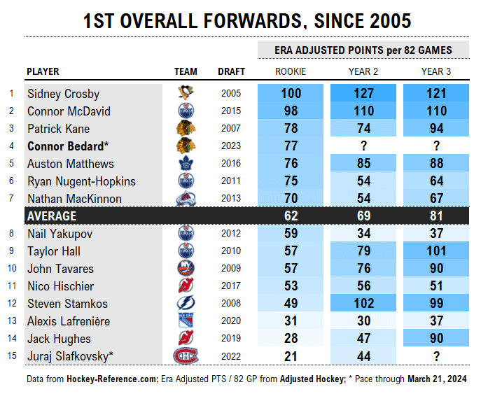 Many superstars – Kane, Matthews, Hall, Tavares – saw fairly normal development curves in terms of production. Maybe that’s what we’ll see from Bedard. His first year in Chicago is eerily similar to the franchise pillar he replaced in Kane. Regardless of what’s next, as a rookie on a team starved for scoring, Bedard has already produced near the average rate of a first-overall pick’s third NHL season.