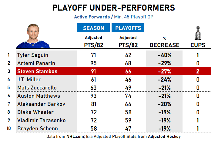 Yes, that’s right. Two-time Cup-winning captain Steven Stamkos sees the third-biggest drop in production in the playoffs. Regular Season Stamkos scores at an adjusted pace of 45/46/91. His alter ego, Post-Season Stamkos, falls to 31/35/66. In the Lightning’s four Final appearances, Stamkos finished tied for third in team scoring three times (2015, 2021, 2022) and played just one game in 2020. He’s never driven Tampa’s playoff bus.