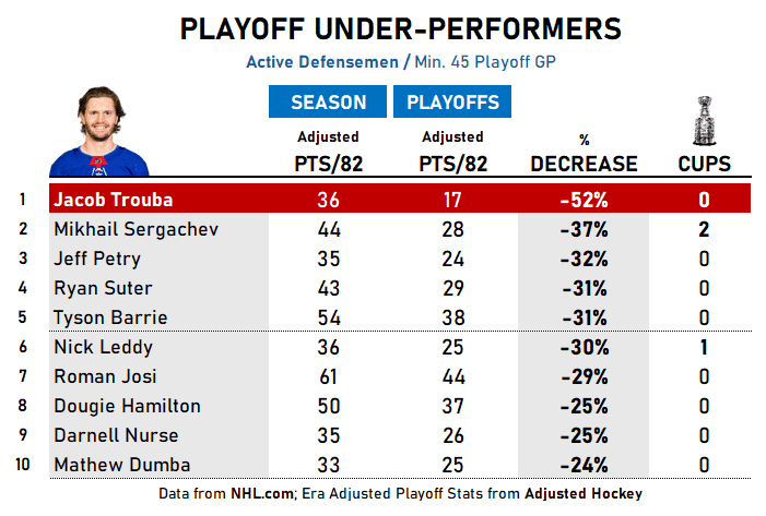 Public Enemy #1 Jacob Trouba sees the most significant drop in production come playoff time (-52%!) among active defenders. That’s a shame. Runner-up is two-time Cup champ Mikhail Sergachev, who put up just 23 points in 71 games across Tampa’s three Cup Finals appearances. The only Norris winner to grace the list is Roman Josi, having anchored middling Nashville playoff teams outside of 2016-18.