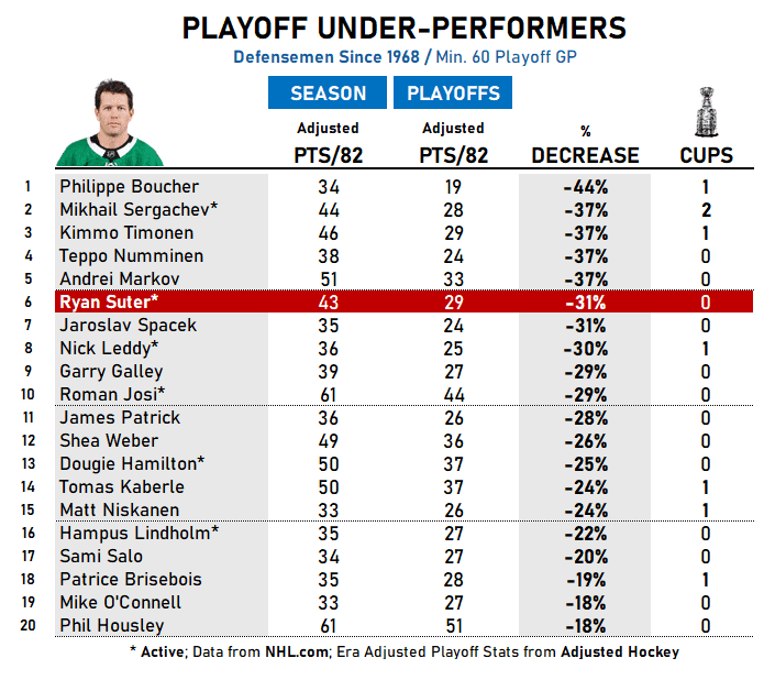 Before we identify the biggest playoff underperformers, we need to set a critical threshold. We’re not interested in Ryan Reaves scoring at a 13-point regular season pace down to a six-point playoff pace. For forwards, we’re filtering to a career regular season minimum of 0.7 era adjusted points-per-game — consistently legitimate scoring threats. So, it’s important to recognize that to be on these lists, you’re already a high-performing NHL player.