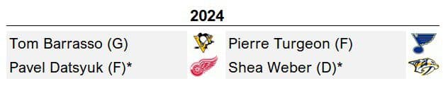 Datsyuk, the slippery magician and two-way force, dangles his way to election on the first try. He’s joined by the underrated Weber, a four-time year-end all-star and anchor on three best-on-best Team Canada titles. Two long overlooked players join them in Turgeon (most career adjusted points outside the HHOF) and Barrasso, a prickly personality but a five-time Vezina finalist and two-time Cup winner in Pittsburgh.