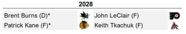 We’re giving Kane only two more seasons based on the recovery and outlook of his hip surgery. Arguably the greatest American-born player in NHL history, he’ll headline 2028 with underappreciated Norris winner Burns. Durable, dominant, and fun, Burns is worthy, regardless if he secures a Cup before retirement. Joining them? Long-time American holdovers LeClair and Tkachuk, both unfairly overlooked by virtue of the offensive graveyard of their peaks. Adjusted for era, the pair combined to score 40 goals 11 times.