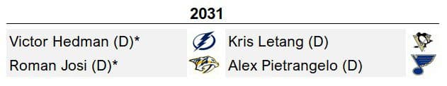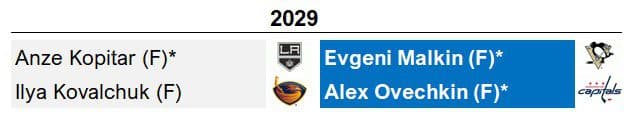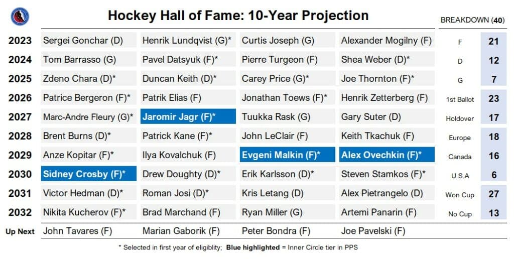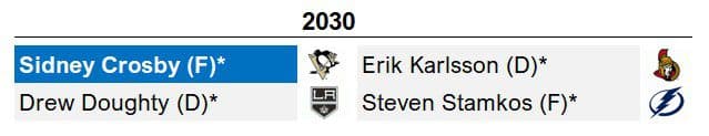 If the 2025 or 2029 Class left you weak in the knees, 2030 might put you on LTIR. The perpetually brilliant face of hockey and the #3 forward all-time in PPS, Crosby, is joined by an electric array of first-ballot talent. Joining Sid up front is all-world sniper Stamkos, who sneakily has a shot at Inner Circle status. Two of the finest blueliners of the cap generation, Karlsson and Doughty, complete a cohort that might sniff best-ever status. The retiring talent in and around 2028 to 2032 will yield a sizzling pack of no-doubt choices.