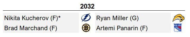 We’re really far into the future now. While we can assume a 65-year-old Paul Maurice is still delivering entertaining press conferences and the Leafs are one gritty sixth defenseman from a Cup, we’re now projecting players set to retire in six seasons. In 2032, Kucherov is the valedictorian, joined by underappreciated class clown Marchand. Panarin has quietly had a prime for the ages, and his willingness to openly oppose the War on Ukraine should be remembered favorably. Though Tomas Vokoun is statistically a better choice than Miller, it might take me until 2052 to move that needle; as such, the Vezina-winning Miller, regarded as hockey’s best for a spell, is a fitting selection.