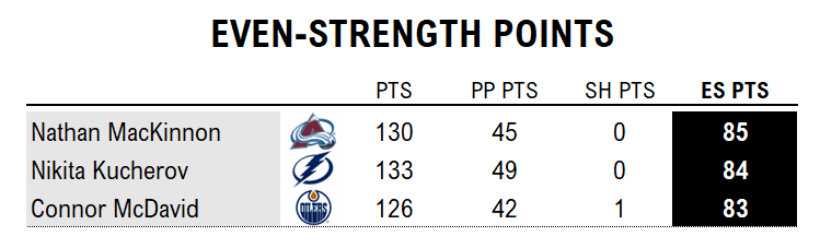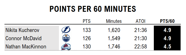 Edge: Kucherov and McDavid. They’ve kept up despite seeing 6% less ice time per night than MacKinnon. Both McDavid (two games missed) and Kucherov (one) have not played the full schedule.