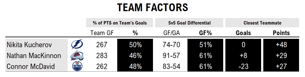 Breakdown: When it comes to factoring in on his team’s goals (50%) and point lead on his nearest teammates (a remarkable +48), Kucherov slays. But for all that offence created, the Lightning barely win Kucherov’s minutes — they’ve scored just four more goals than they’ve allowed at 5-on-5. MacKinnon and McDavid each have a 61% goal share, producing offence without sacrificing goals against. When we look at nearest teammates, it’s McDavid that’s least dominant. His 27-point team lead is third and he trails Hyman by 23 goals (and Draisaitl by 10).