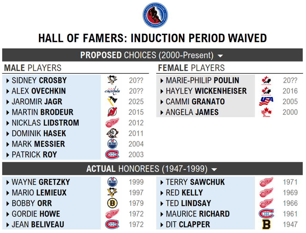After the instant induction of Wayne Gretzky in 1999, the Hall amended its by-laws so that no player could be enshrined immediately. No special tier makes anyone more or less distinguished today. The only path to direct induction now is “by reason of grave or terminal illness or injury” — a button the Selection Committee fortunately hasn’t had to push yet.