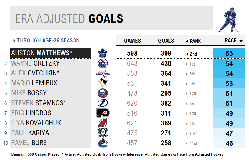 Yes, with proper context, that’s how great Matthews’ career goal scoring has been. And sure, the margin is less than one goal per 82 games on both Gretzky and Ovechkin. But relative to his own time, #34 in blue and white has been the top per-game sniper through his first eight NHL seasons.