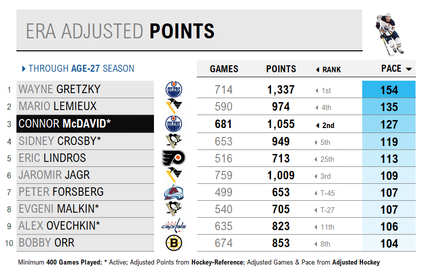 By pairing durability with generational ability, the Oilers‘ captain has a tremendous opportunity to decimate hallowed career marks. Adjusted to era, he’s already 81 points ahead of Lemieux at the same age. And 106 points clear of Crosby. Rarified air.