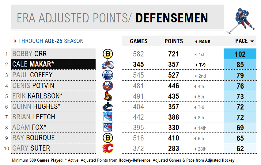 What Have We Been Witnessing?: Through age 25 — adjusted for era — Makar is second only to Orr in terms of points-per-game by a defenseman.