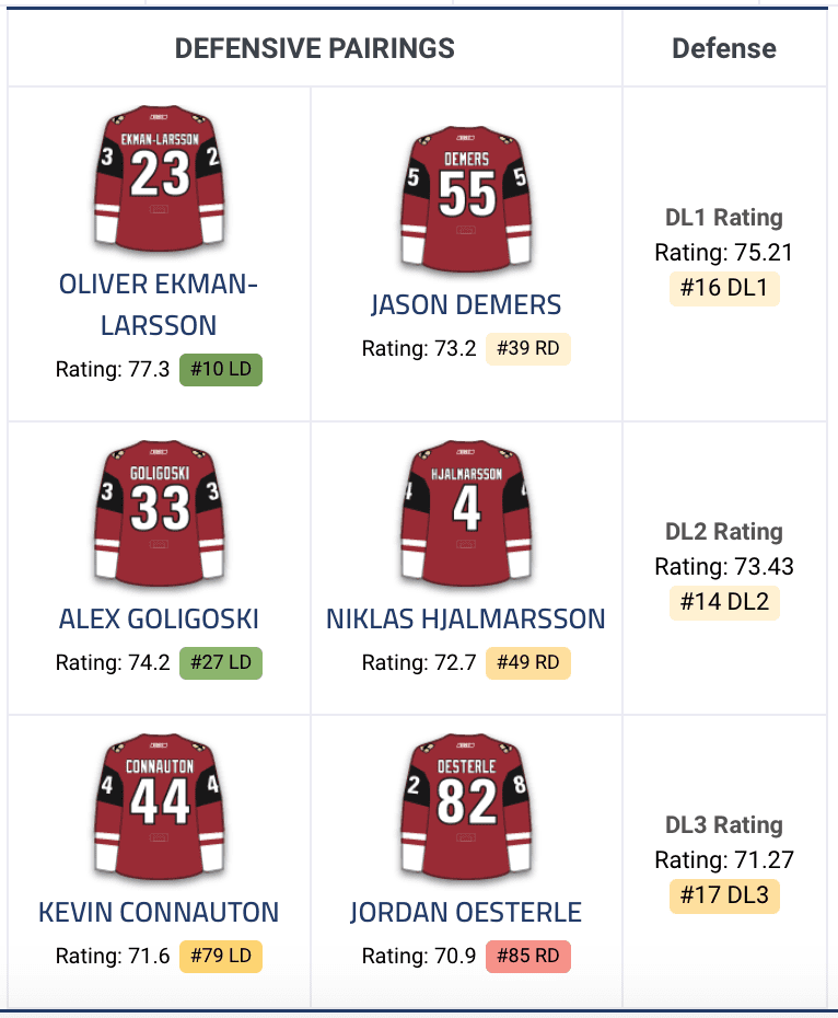 Oliver Ekman-Larsson highlights what is an otherwise lackluster defensive corps. He scored 14 goals and added 28 assists last season. He’s never been one to rack up assists from the blueline, but he can score with the best of them. He’s scored at least 12 goals in five straight seasons. He signed an eight-year contract extension in June and is set to play big minutes to start the season, given the absence of Jakub Chychrun. Chychrun is still recovering from the torn ACL he suffered last April. While there’s no firm timetable set, he is expected to make his season debut before the end of October. Veteran Jason Demers will skate on the top pair in the interim. The former Shark registered 20 points in 69 games last season and had the highest CF% of any Coyotes’ blueliner.