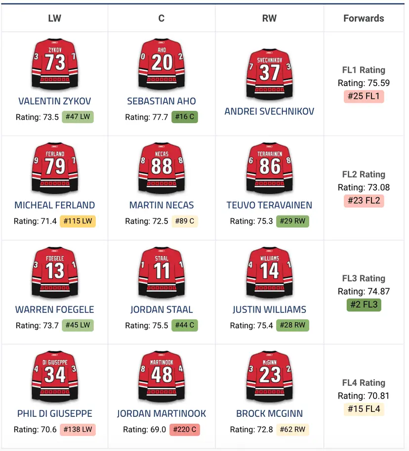 ➕ Dougie Hamilton (Trade) ➕Micheal Ferland (Trade) ➕Andrei Svechnikov (Draft) ➕Calvin de Haan (Free Agency) ➕ Petr Mrazek (Free Agency) | ➖ Jeff Skinner (Trade) ➖ Noah Hanifin (Trade) ➖ Elias Lindholm (Trade) ➖ Derek Ryan (Free Agency) ➖ Cam Ward (Free Agency) |