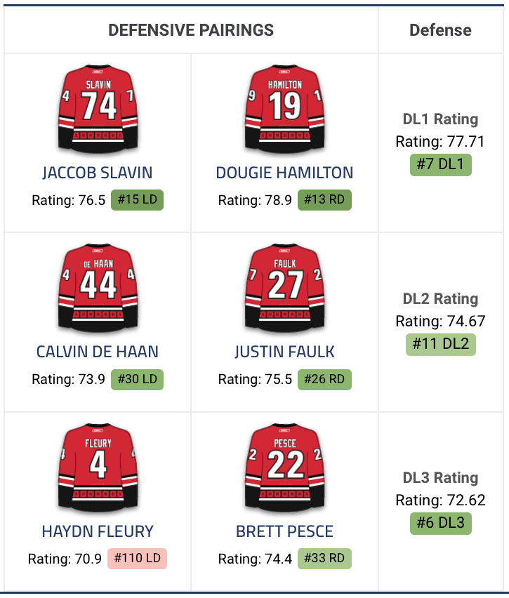 The Hurricanes completely overhauled their blueline in the off-season, shipping Hanifin away for Hamilton and signing the formidable Calvin de Haan to solidify their top-four. The former first-round pick was one the most sought-after defensemen in a relatively-weak free agent class. With Haydn Fleury and Brett Pesce making up their third pairing, the Hurricanes have one of the highest-rated defensive corps in the NHL, according to Corsica.