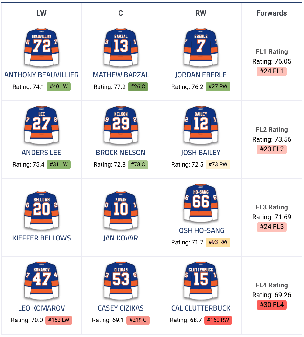 | Anthony Beauvillier (22) | Jordan Eberle (35) | Jordan Eberle (61) | Mathew Barzal (5) | Anders Lee (17) |