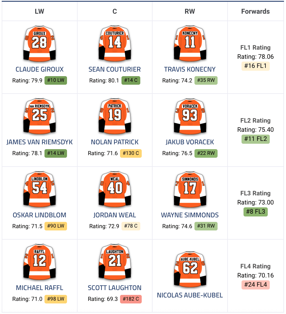 At the start of last season the Flyers moved Claude Giroux to the wing and Sean Couturier to centre the top-line and it worked fantastically. The duo played over 1100 minutes together at 5v5 and posted a strong 55.14 CorsiFor%, 53.32 ScoringChancesFor% and 63.64 GoalsFor%. Travis Konecny, Wayne Simmonds and Jakub Voracek rotated on the right-side and Konecny figures to start there this season.