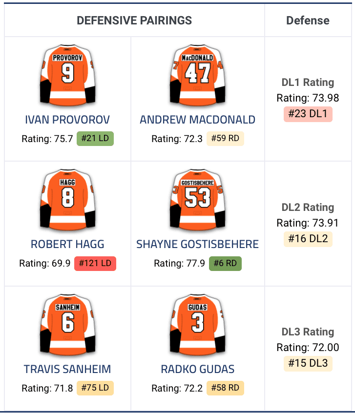The Flyers have one of the deepest prospect pools on the blueline. Travis Sanheim is projected to be the one to become a full-time NHLer this season with Samuel Morin and Philippe Myers staying put in Lehigh Valley (AHL) for now. Sanheim joins a blueline that is led by the offensive-minded Shayne Gostisbehere and the 21-year-old Ivan Provorov.