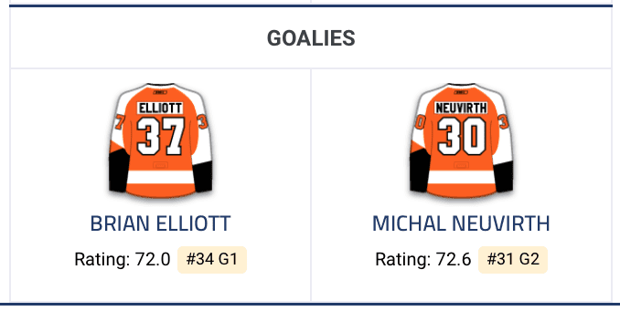 The Flyers’ goaltending situation is a clear timeshare. Brian Elliott hasn’t started more than 45 games since 2011 and Michal Neuvirth’s career-high is 32 starts. Elliott figures to have the lion’s share of the workload. The timeshare is projected to be 60/40 split.