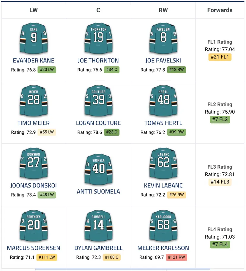 | Logan Couture (27) | Joe Thornton (43) | Joe Pavelski (64) | Brent Burns (7) | Erik Karlsson (23) |
