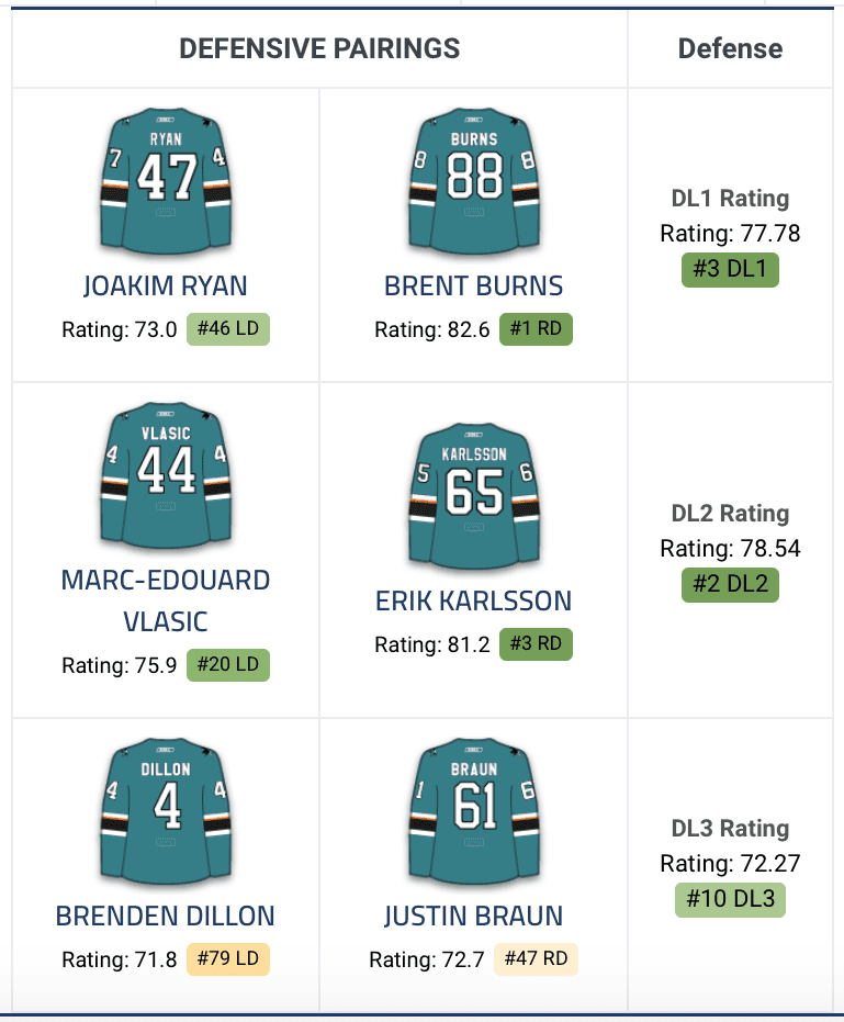 Karlsson has seen a myriad of defensive partners throughout training camp and the preseason, but he was playing with Marc Eduoard-Vlasic as recently as September 27. The two are a perfect fit and project to be together on opening night. Karlsson is no slouch in his own end, but there is a level of risk-taking in the way he creates offense. There is no better player to mitigate those concerns than Vlasic, one of the best defenders in the game. He is an excellent penalty killer and will continue to log plenty of shorthanded minutes, freeing up Burns and Karlsson to do what they do best. Vlasic chipped in offensively with 11 goals last year and should see his production improve while skating alongside Karlsson.