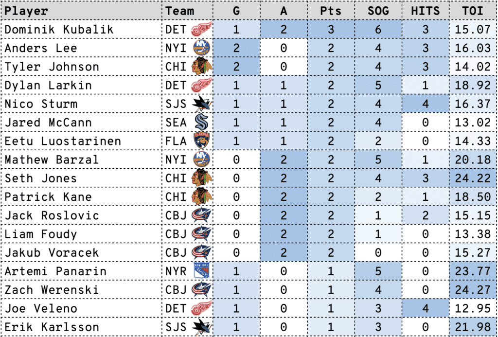 — DaWindyCityFS (@DaWindyCityFS) October 23, 2022Alex Stalock continued his strong return to the NHL, earning his second win of the year in a 30-save effort (.882 SV). Tyler Johnson had two goals (1,2) and a team-high four SOG in the win, while Seth Jones and Patrick Kane added multiple powerplay assists to join him as the Blackhawks’ multi-point scorers. Martin Jones was the losing goaltender as he struggled throughout, allowing five goals on 27 shots (.815 SV%). Jared McCann was the only Seattle player with more than one point as he had a goal (3) and an assist to go along with his team-leading 4 SOG. Matty Beniers (2), Andre Burakovsky (3) and Vince Dunn (1) each scored a goal for the Kraken in the loss.