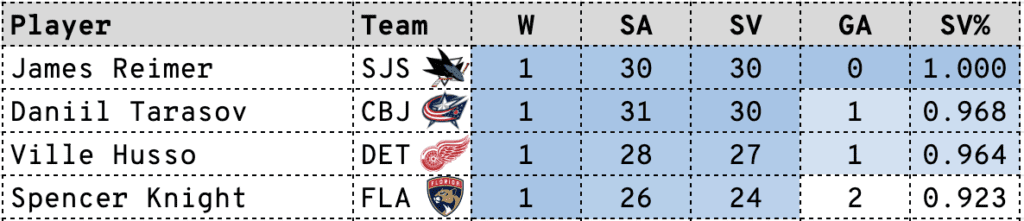 Spencer Knight won his second game in as many starts, stopping 23 of 25 shots (.920 SV%) in a 3-2 win over the New York Islanders. Florida spread the scoring out, with contributions from unexpected sources as Eetu Loustarinen (2), Anton Lundell (1), and Ryan Lomberg (1) scored the Panthers’ goals. Anders Lee did his best to fight back for New York, scoring both of their goals (3,4) on the powerplay in the losing effort, with Matthew Barzal adding assists on each (2A). Semyon Varlamov allowed three goals on 32 shots (.906 SV%) as he took his first loss of the season.