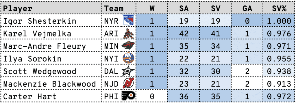 — NHL (@NHL) November 2, 2022Carter Hart continued his incredible play, stopping 35 of 36 shots in the loss. It was his second straight loss, but Hart ranks fourth in the NHL with a .943 SV% through seven games.
