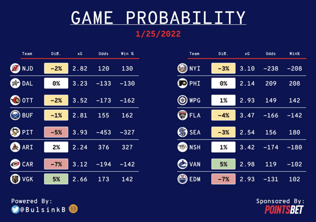 Each day we will look at each game, the Sportsbook Odds (via PointsBet), and the odds of each team winning based on the model created by Philip Bulsink. Based on those two numbers, we can quickly identify which teams we need to bet on, which teams to avoid and which lines to keep an eye on throughout the day.