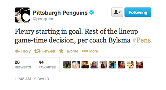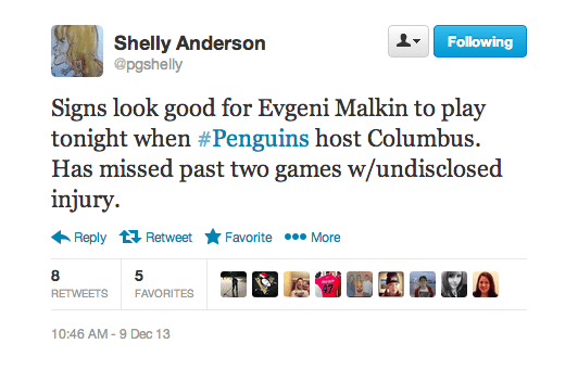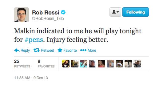 Dec. 9, 12:05 p.m – Malkin indicates that he will be in the lineup tonight, but head coach Dan Bylsma said that his lineup will be a game-time decision. It appears it will take a late setback in order for Malkin not to play tonight, but monitor his status prior to puck-drop just to be sure.