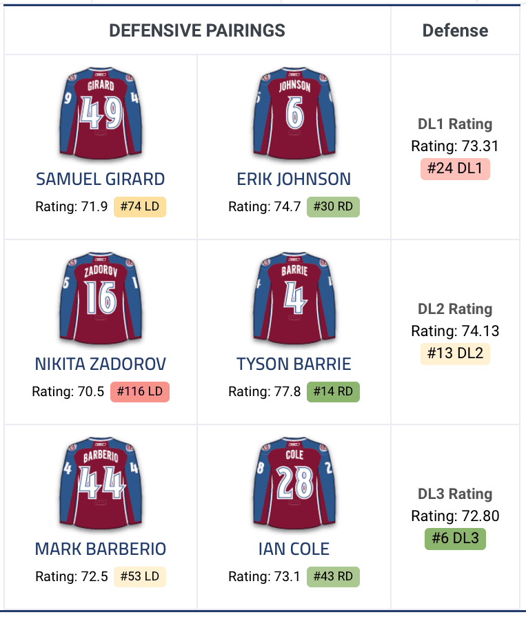 Barberio and the newly-signed Ian Cole project to make a strong third-pairing for the Avalanche. Cole is a strong puck-moving defenseman that’s capable of filling in on the powerplay should Barrie or Girard miss time. He picked up 20 points in 67 games split between the Penguins and Blue Jackets last season. He is an excellent addition to depth of the Colorado blueline. Barberio offers little offensive upside but is strong in his own end; Colorado’s opponents were limited to just 25 scoring chances per 60 at 5v5 when Barberio was on the ice. Him and Cole are the No. 6 rated third-pairing in the NHL, according to Corsica.