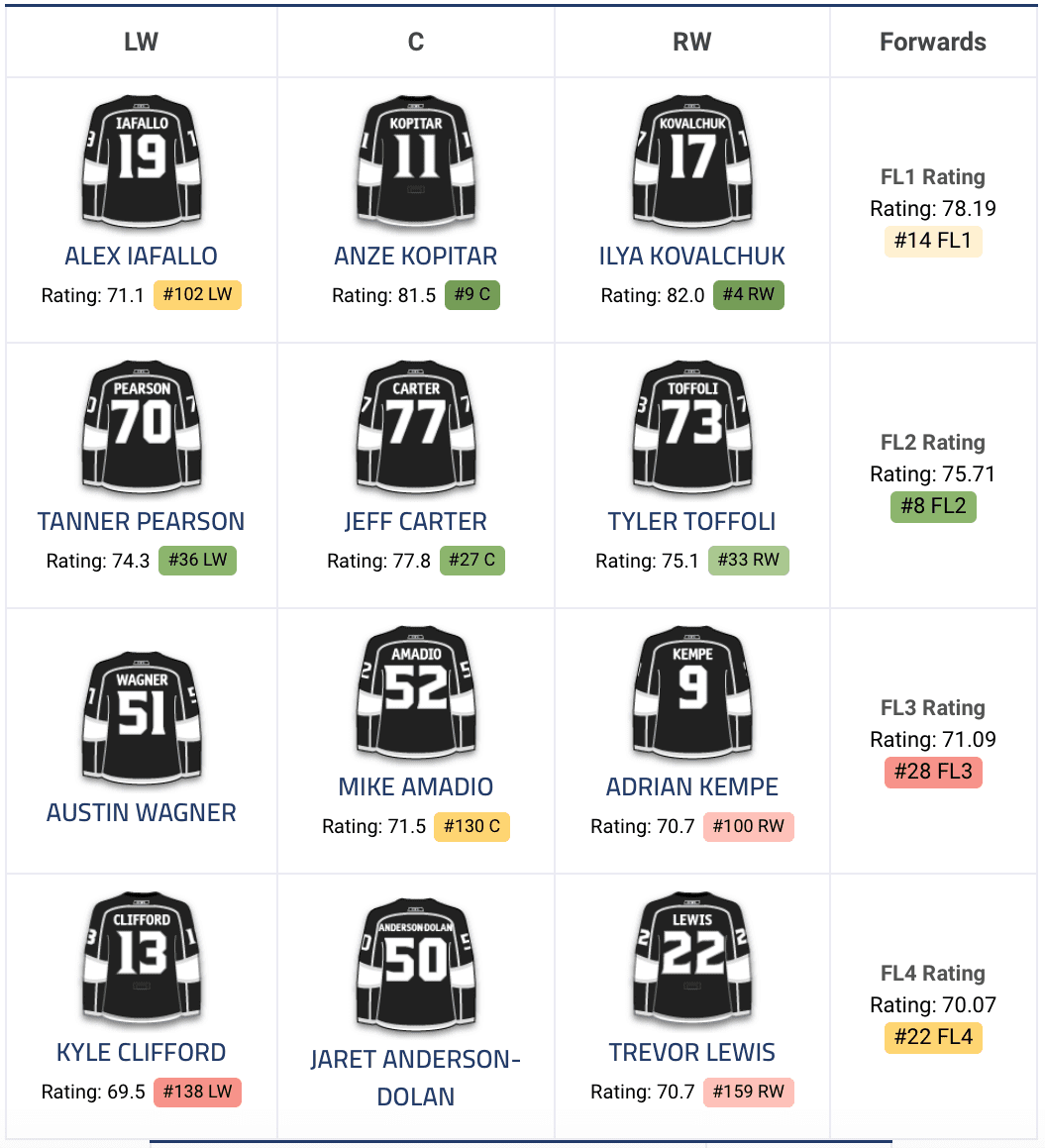 While nothing is set in stone, the combination of Carter, Tanner Pearson, and Tyler Toffoli is the most likely second line for LA. The trio became a common fallback for Stephens late last year and they were effective. They registered a 52.97 CF% at 5v5 together and averaged 31 scoring chances per 60. There is some speculation that Carter might move over to the wing to play with Kopitar in Brown’s absence, but that would leave LA without a viable second-line centre. This second line has plenty of experience playing together and it gives the Kings a strong, well-rounded top-six. Adrian Kempe is the most likely to move into the top-six should Stephens opt for a different look.