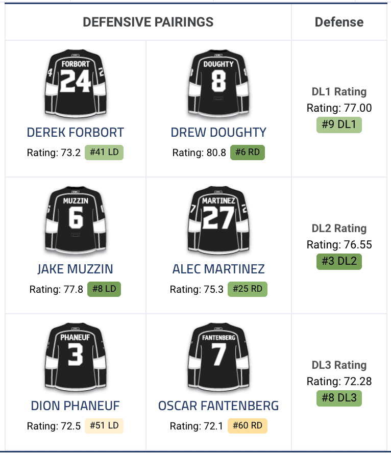 Jake Muzzin and Alec Martinez make up the third-best second pairing in the NHL, according to Corsica. Muzzin is another dynamic two-way defenseman and is coming off a career-high 42 points. He’s posted a CF% greater than 52% in every year he’s been in the league. He is excellent at transitioning in and out of the zone and is an integral part of this blueline. Martinez’s game is more defensive in nature, but he can chip in offensively. He picked up nine goals and 16 assists in 77 games last season. Muzzin could move up to the top pair if Forbort’s back injury forces him to miss any more time, which would in turn bump Dion Phaneuf into the top four.