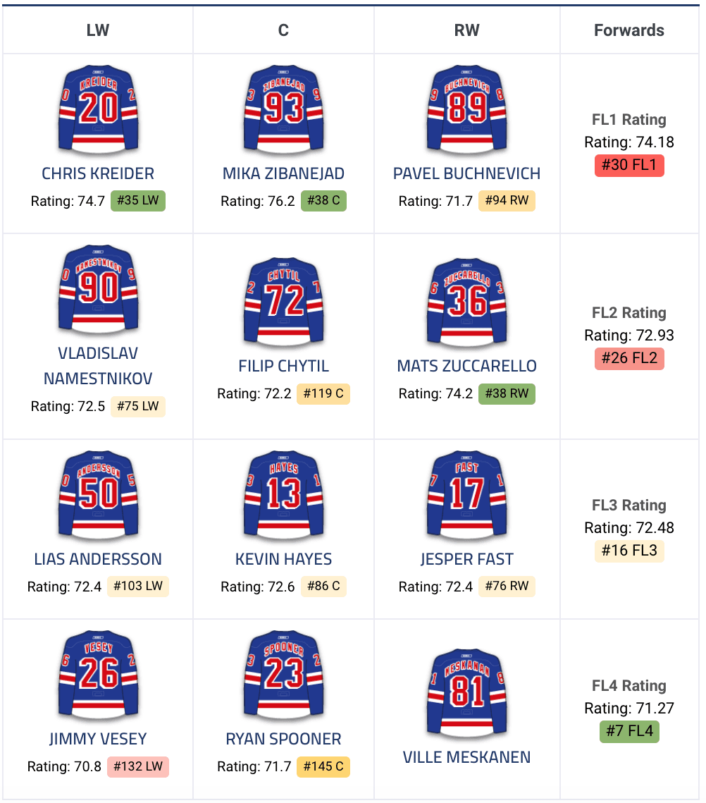 Chris Kreider and Mika Zibanejad should continue to be heavily-featured on the Rangers’ top line this season. They were effective when paired with Pavel Buchnevich, averaging 33 scoring chances per 60 at 5v5 together. Though they may be productive, a lack of star power leaves the Rangers with the second-worst first line in the league, according to Corsica Hockey Player Ratings.
