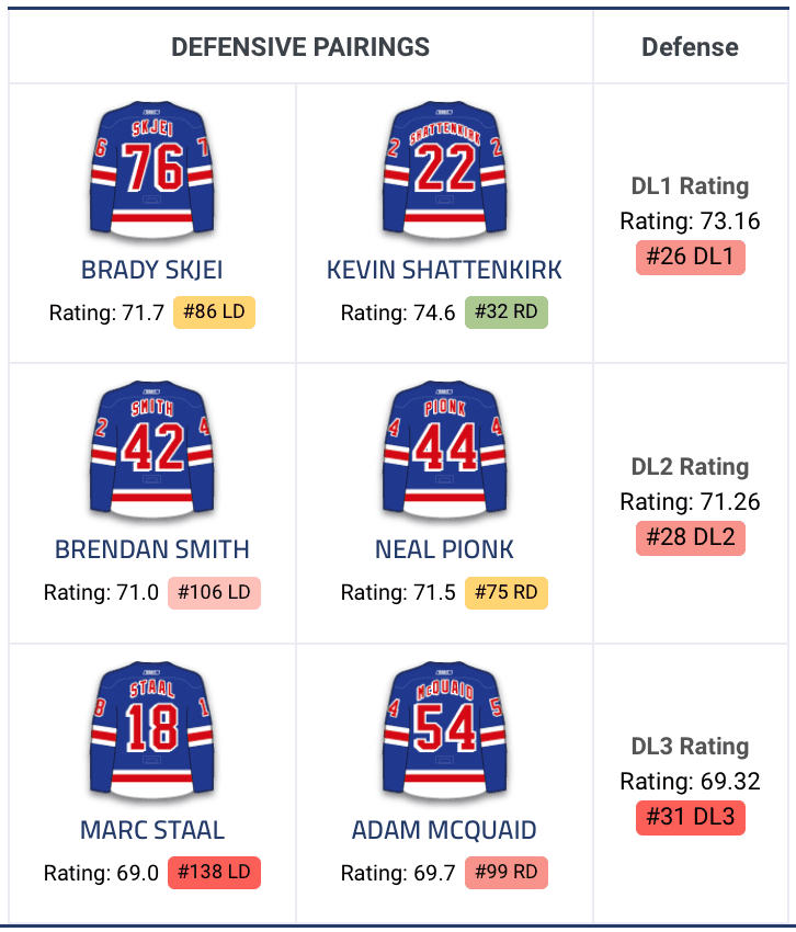 24-year-old Brady Skjei should be somewhat of a minutes-eater for the Rangers this season. He had an ATOI of 21:02 last season but regularly played north of 24 minutes a night following the McDonagh trade. While he is no doubt a competent defenseman, he would never feature on the top pair of a contending team. Him and Shattenkirk rank as the 26th best first-pairing in the NHL, according to Corsica.