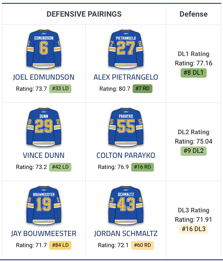 The Blues lost some valuable depth in the O’Rielly trade, shipping Patrik Berglund, Tage Thompson, and Vladimir Sobotka to the Sabres. Despite that, the Blues still have a wealth of talent in their bottom-six, most notably Alex Steen, Robby Fabbri, and the recently-signed Tyler Bozak. All three can assume larger roles if necessary, though Fabbri may be sidelined with a groin strain to start the year. Jordan Kyrou, the No. 35 overall pick from the 2016 NHL Entry Draft, could also see some meaningful minutes this season. He’s projected to start on the fourth line but has skated in the top-six at times this preseason. Overall, the Blues have one of the stronger group of forwards in the league.