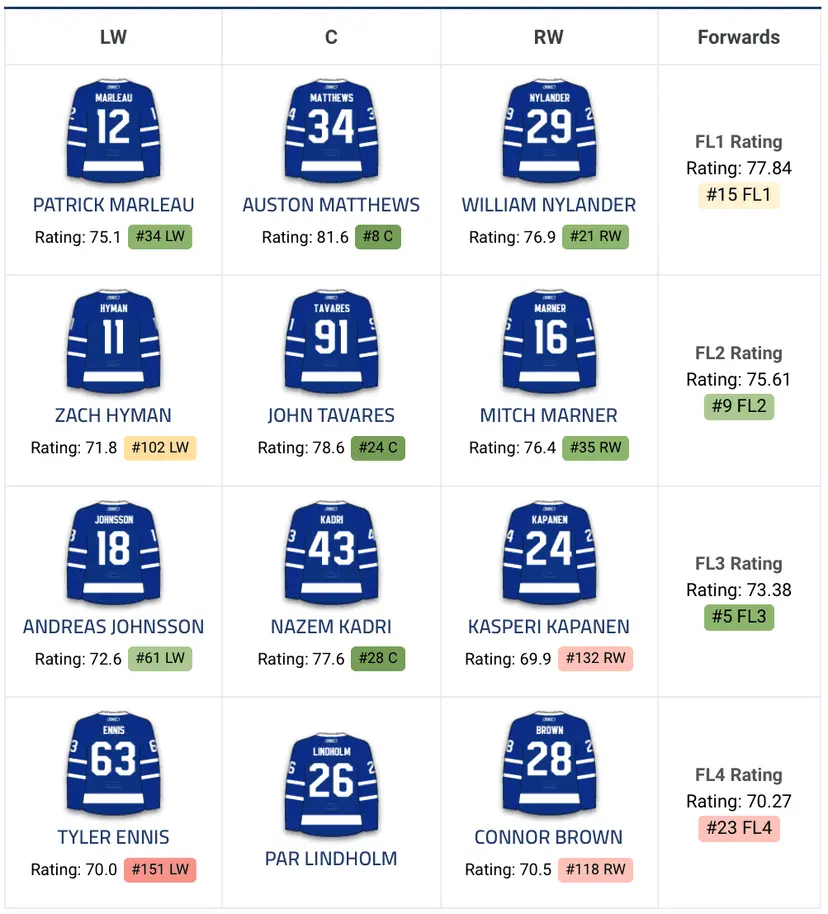 ➕ John Tavares (Free Agency) ➕ Tyler Ennis (Free Agency) ➕ Par Lindholm (Free Agency) ➕ Josh Jooris (Free Agency) ➕ Jordan Subban (Free Agency) | ➖ James van Riemsdyk (Free Agency) ➖ Tyler Bozak (Free Agency) ➖ Leo Komarov (Free Agency) ➖ Matt Martin (Trade) ➖ Roman Polak (Free Agency) |