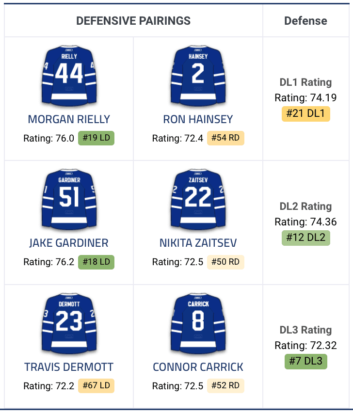 The blueline is this roster’s biggest concern and it isn’t close. Morgan Rielly and Jake Gardiner are legitimate top-pair defensemen, but Ron Hainsey and Nikita Zaitsev are far from premier options on the right side. Hainsey played almost twice as many minutes at even strength than the Leafs’ next closest defenseman and was noticeably fatigued by the end of the season. Babcock will need to trust his younger defenders more on the penalty kill, especially now that Roman Polak is off the roster.
