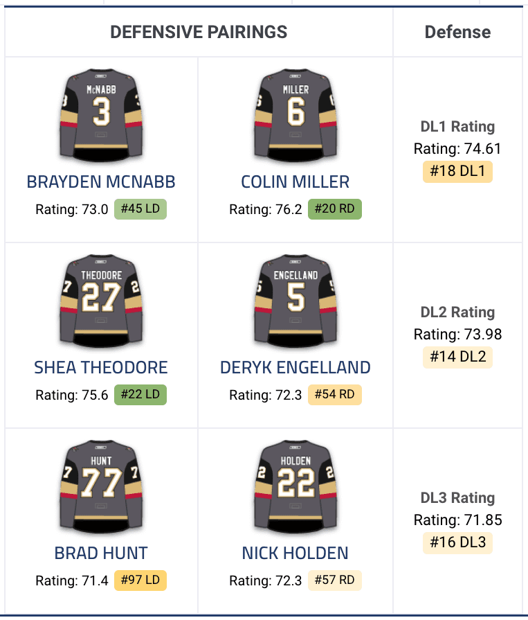 Haula is the highlight of an otherwise mediocre bottom-six. Cody Eakin and Pierre-Edouard Bellemare are serviceable third and fourth liners, but they’re not adequate replacements for their top-two centres. Vegas’ depth upfront falls short of what they had last season. That could come back to bite them if one of Stastny or Karlsson miss time.