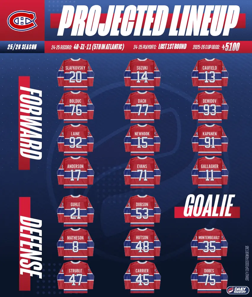 The main new face up front is Zachary Bolduc, whom the team acquired in the deal that sent Logan Mailloux to St. Louis. The Trois-Rivières, Quebec native had a solid 36 points in his first full NHL season last year, and 45-plus points seems like a realistic goal in Montreal. He battles hard and has a good shot, so look for him to pot 20 this year.