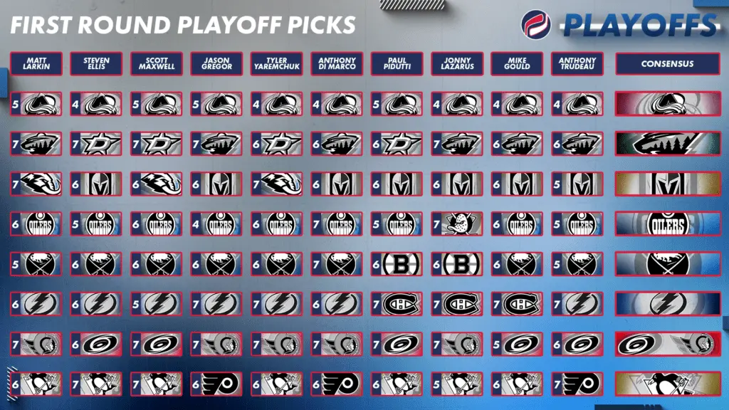 The Colorado Avalanche are the lone consensus pick of Round 1. No one has the Kings winning more than a game, while 60 percent of the panel calls for a sweep. It’s the Presidents’ Trophy winners against a team that had the second-fewest regulation victories in the entire NHL. We ain’t overthinkin’ this one. Thanks the the playoff format, the Dallas Stars and Minnesota Wild are forced to play each other with the NHL’s third- and seventh-best records, respectively. Every ballot has the series going at least six games. The Stars have been to three straight Western Conference Finals, but 60 percent of our voters have the Wild breaking through for their first series win since 2014-15. Its it the Quinn Hughes factor? Meanwhile, 70 percent of the panel predicts the John Tortorella Bump will propel the Vegas Golden Knights past a dangerous Utah team, while all but one voter believes Connor McDavid in God Mode, with or without Leon Draisaitl for Game 1, will be enough to topple the young Anaheim Ducks.