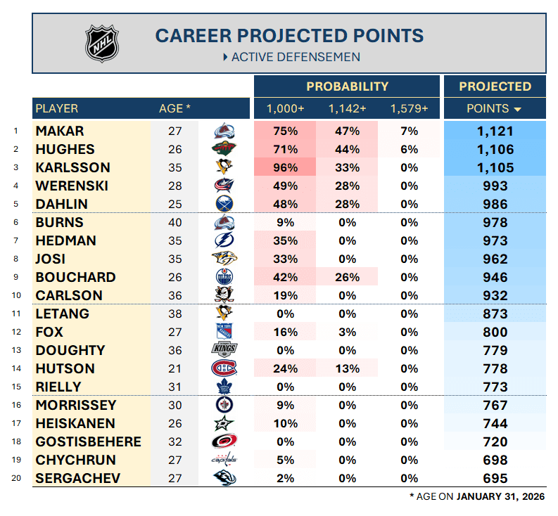 This is an exceptional era for offensive defensemen. Nineteen blueliners have non-zero probability of 1,000 points, led by Karlsson, Makar, and Hughes. But the next tier is interesting: Zach Werenski (49%); Rasmus Dahlin (48%) and Evan Bouchard (42%). Each has reached another tier of production in 2025-26 and will get Norris votes. Stick tap to Habs’ sophomore Lane Hutson, projected for 778 career points in his age-21 season.