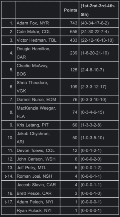 Fox finished voting with 743 points, edging out Colorado’s Cale Makar who had 655 points and Victor Hedman of the Lightning who had 433 points.