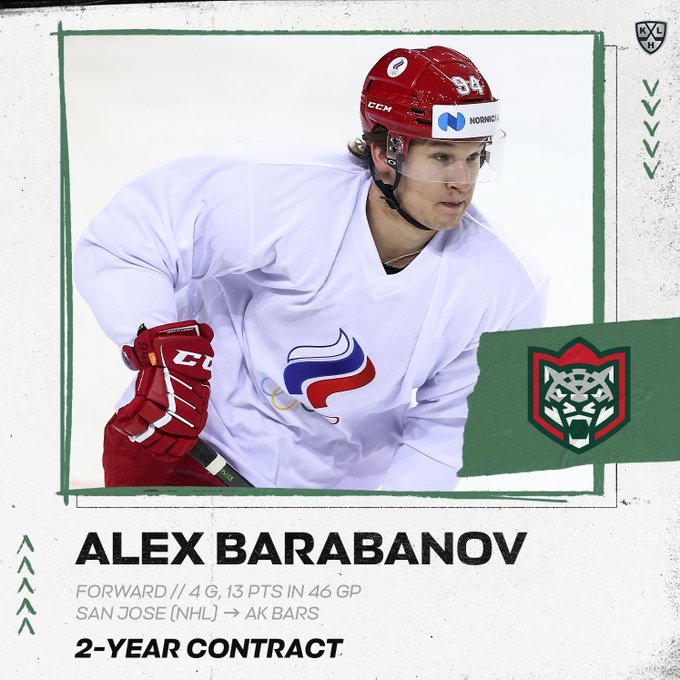 Barabanov hit the open market this summer after his latest two-year contract at $2.5 million average annual value expired. It became quite obvious early on during the offseason that the Sharks were heading in another direction and after some consideration on returning to the NHL, Barabanov heads back home to Russia.