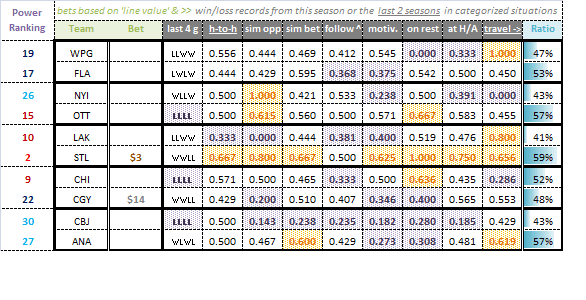 Sometimes teams perform well but don’t win, while other times vice versa (goaltending frequently makes it or breaks it). Therefore, it also seemed prudent to take a look at win/loss records when trying to decide which teams to back (and for what dollar amounts).
