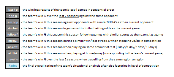 The database stores win percentages for teams when playing under the following situational circumstances: